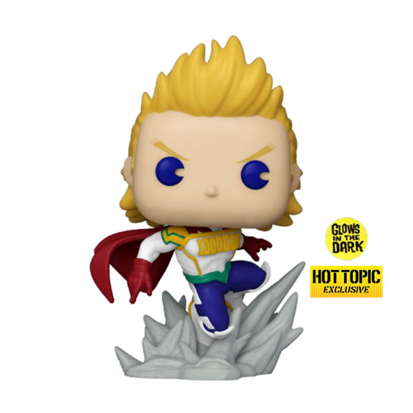 Esta figura presenta a Mirio en su icónico traje de héroe amarillo, azul y blanco, con su capa ondeando al viento y una expresión determinada, reflejando su optimismo y determinación. Su diseño detallado y su pose dinámica hacen de este Funko una representación perfecta del personaje.